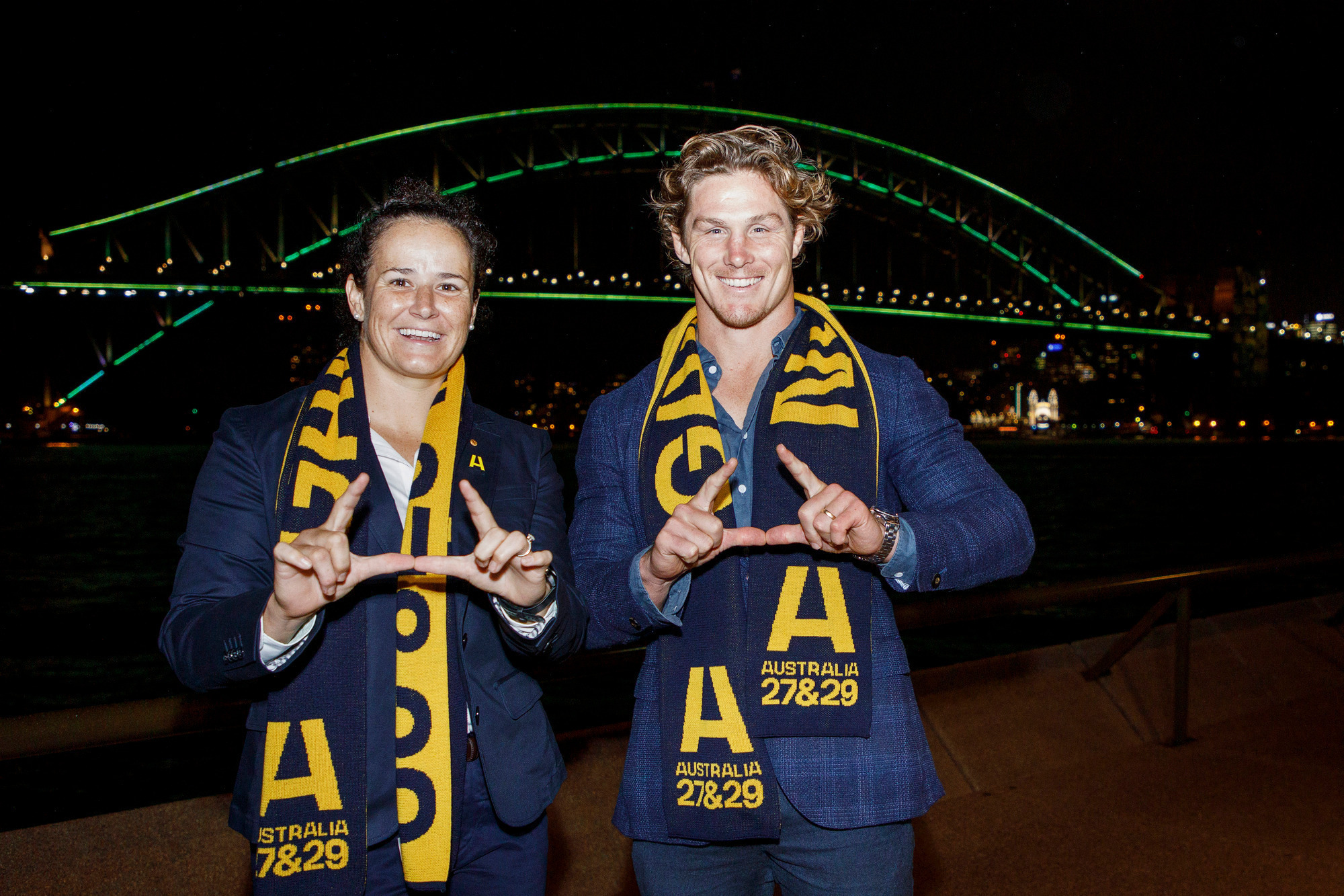 Wallaroos player, Shannon Parry and Wallabies Captain, Michael Hooper in front of the Sydney Harbour Bridge celebrating the announcement that Australia will host the Rugby World Cup in 2027 and 2029.