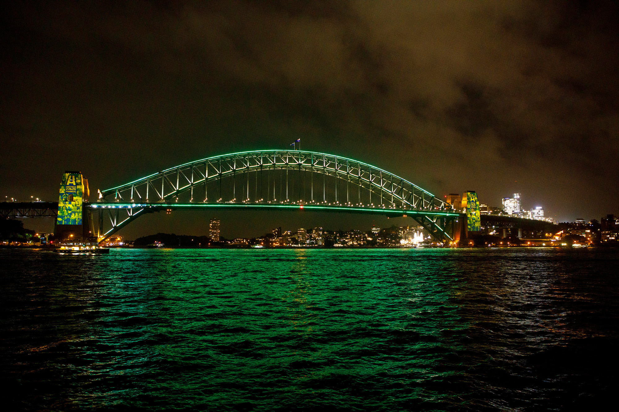 Sydney Harbour Bridge lights up in celebration of Australia being confirmed as the host of Rugby World Cup 2027 and 2029