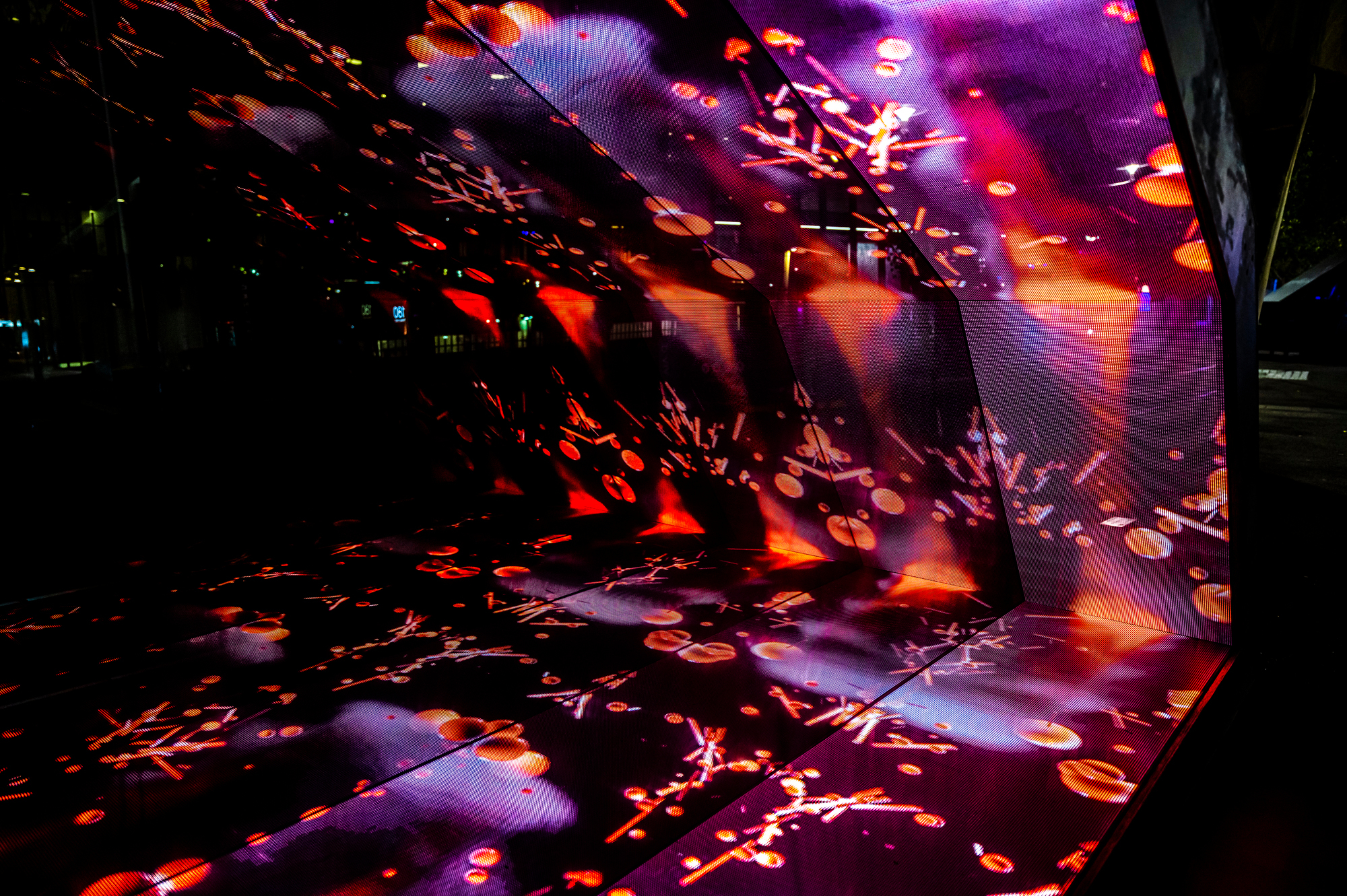 An arresting video projection of a pair of bejewelled stilettos stomping and splashing through puddles of silver paint. It’s a play on the Vivid Sydney 2022 theme of ‘Soul of the City’, as a ‘sole’ of a different kind can be seen as a catalyst for change.