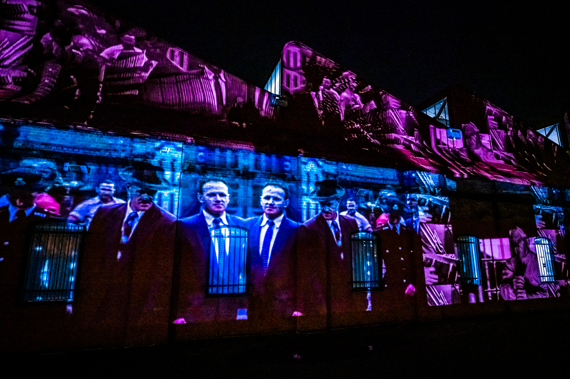 The 'We Dream the City' light projection at the Goods Line, Ultimo during Vivid Sydney 2022...Artists:.Esem Projects: Michael Killalea (Australia) / Sarah Barns (Australia)..Collaborators:.Nigel Cruickshank (Australia) / Gary Sinclair (Australia) / Historical Archive and Digitisation Team TfNSW (Australia) / National Film and Sound Archive of Australia