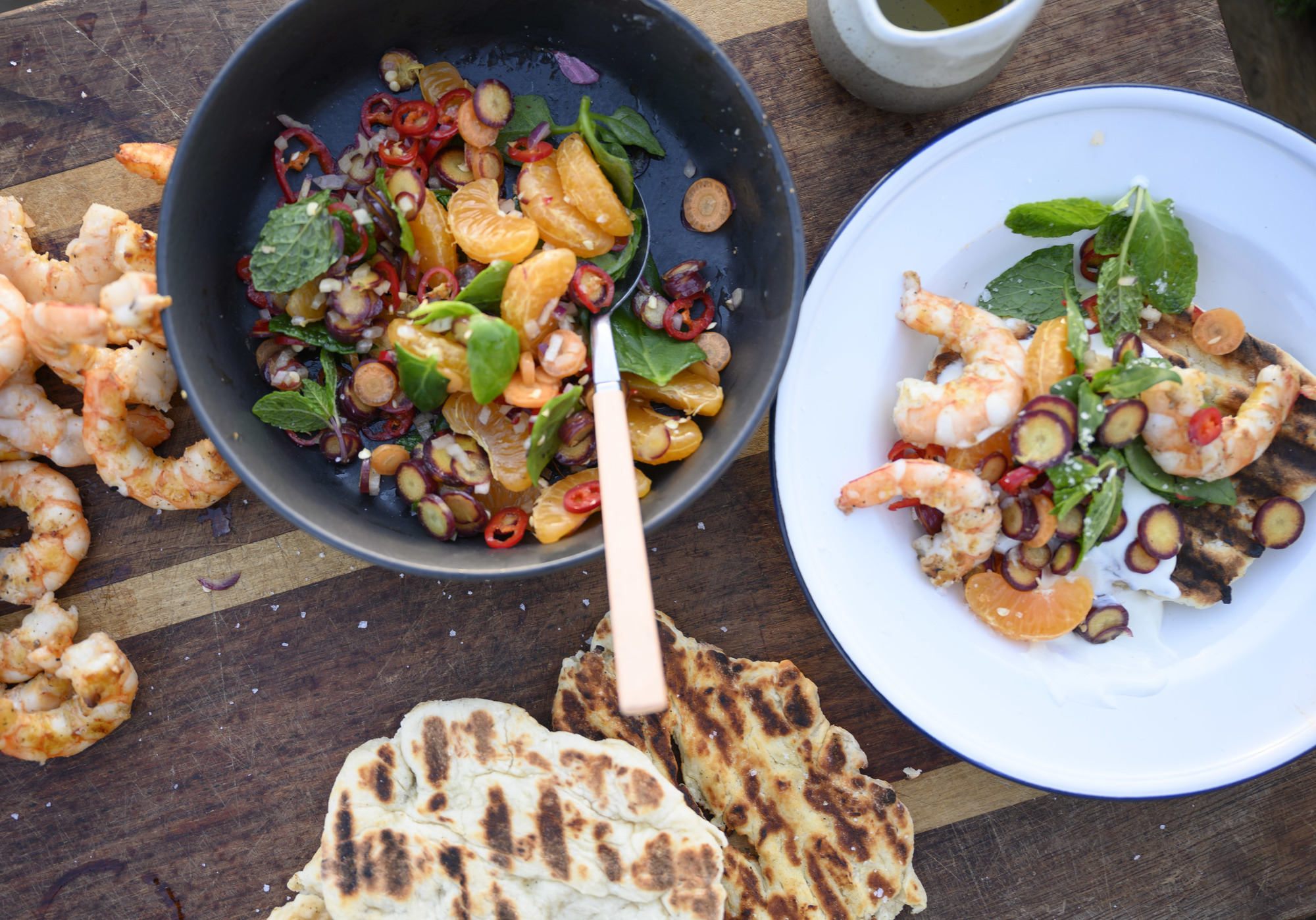 Two ingredient flat bread with grilled prawns, carrot, mandarin and a Warrigal green salad.