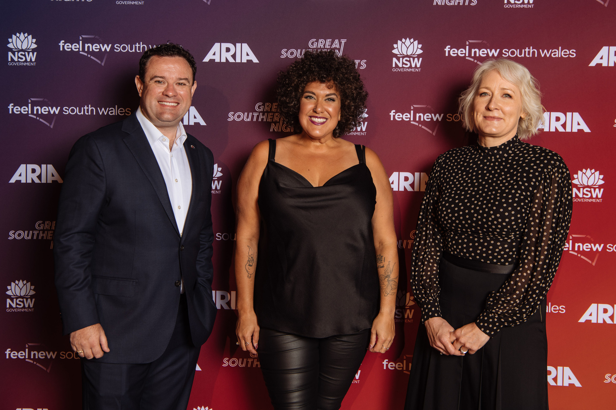 Minister for Enterprise, Investment and Trade, Minister for Tourism and Sport, and Minister for Western Sydney Stuart Ayres, Casey Donovan and ARIA CEO Annabelle Herd at Great Southern Nights 2022 Media Call