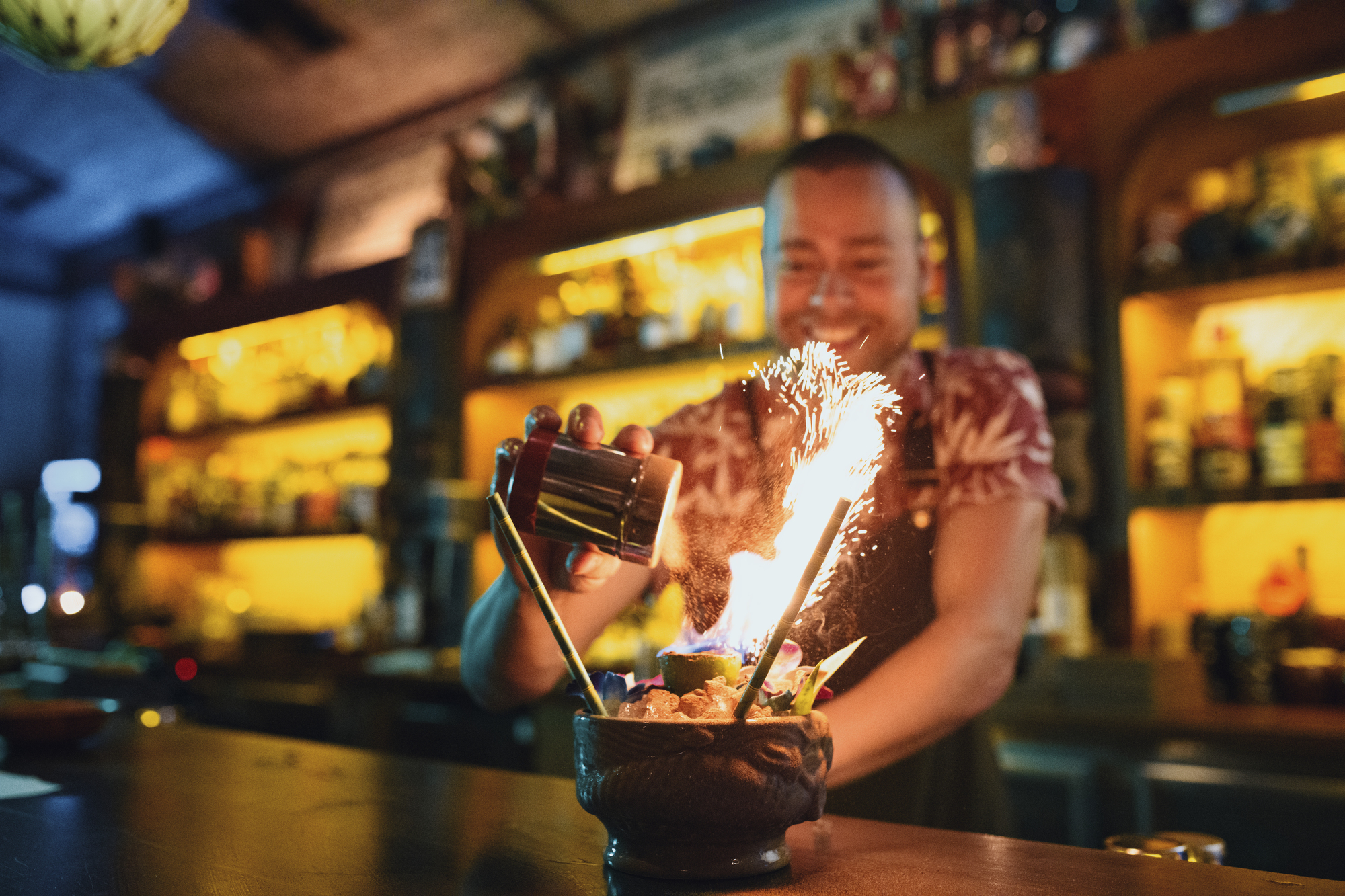 Bartender creating a specialty cocktail at Jacoby’s Tiki Bar, Enmore.
