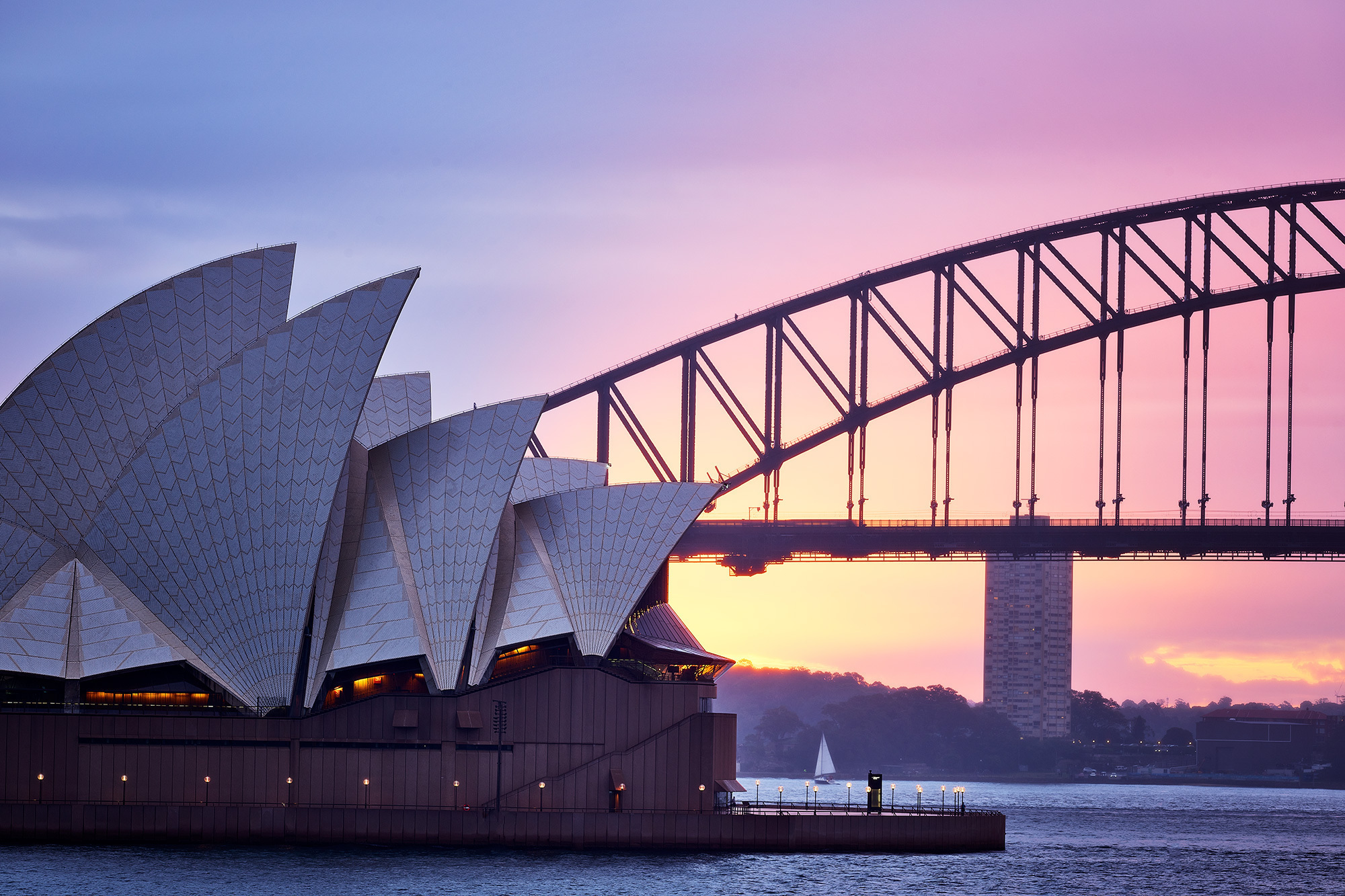 The Sydney Opera House and Sydney Harbour Bridge at sunrise