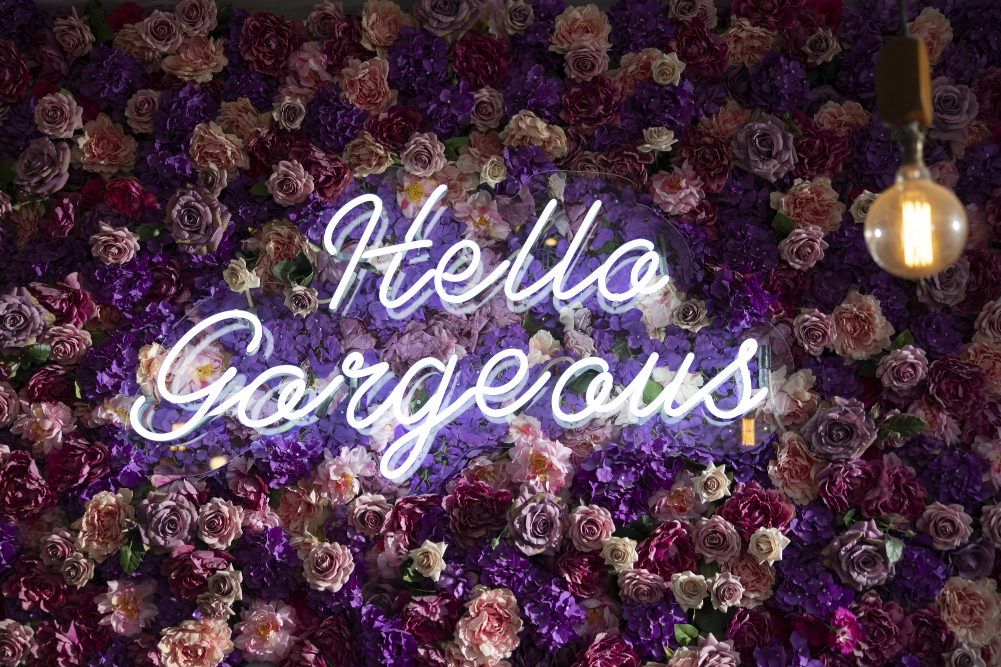 Neon signage on a floral wall at the Social Hideout cafe in Parramatta.