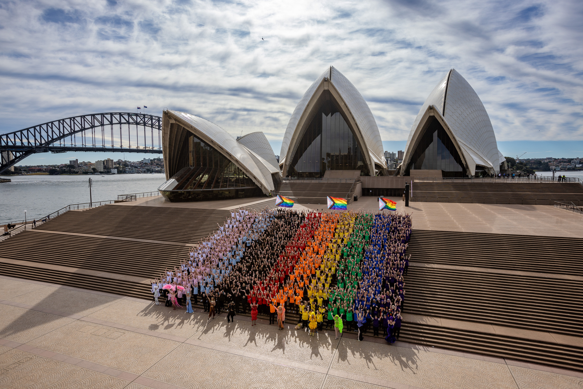 Sydneysiders created a human Progress Flag on the steps of the Sydney Opera House. Credit: Daniel Boud