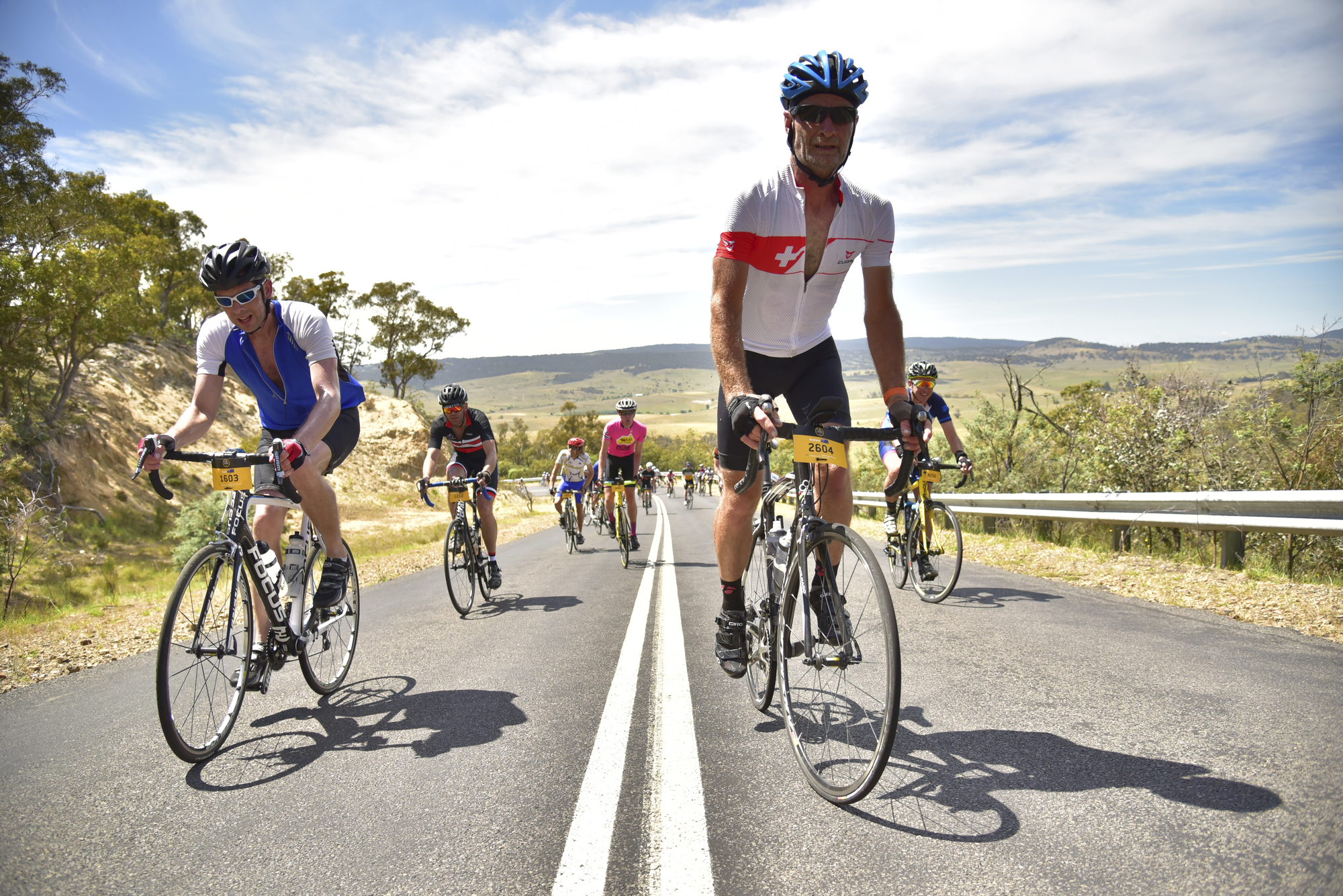 Cyclists competing in the L'ɉtape Australia in the scenic Snowy Mountains.