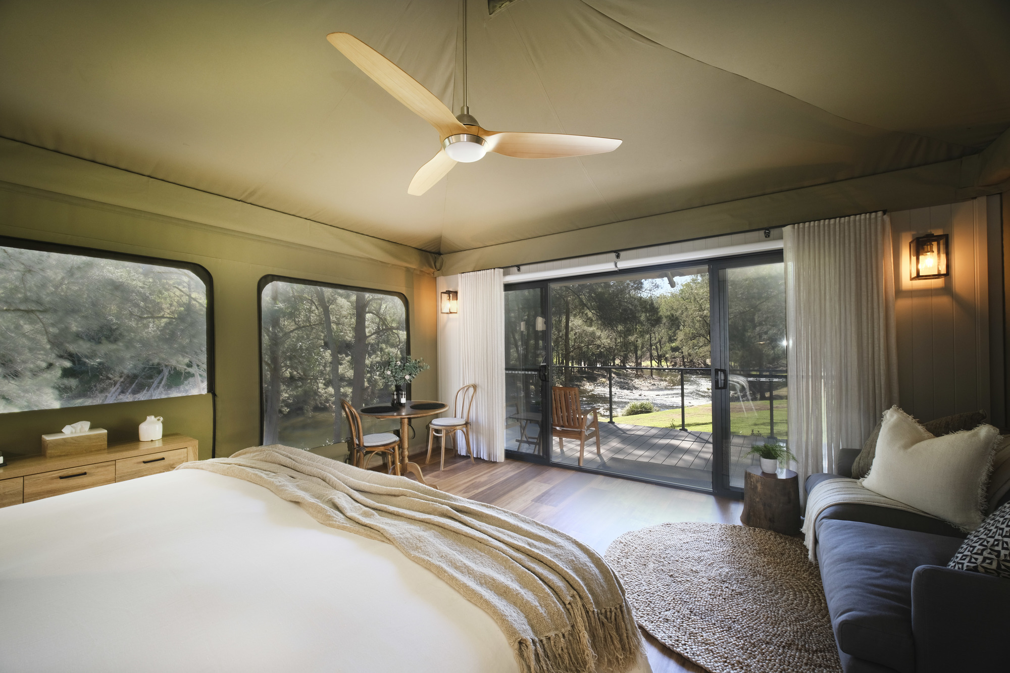 Amaroo Escape is a new luxury eco escape on the banks of the Manning River near Gloucester. Adults-only glamping tents are situated in the pristine Barrington Coast hinterland and feature king beds, kitchenettes and generous bathrooms.