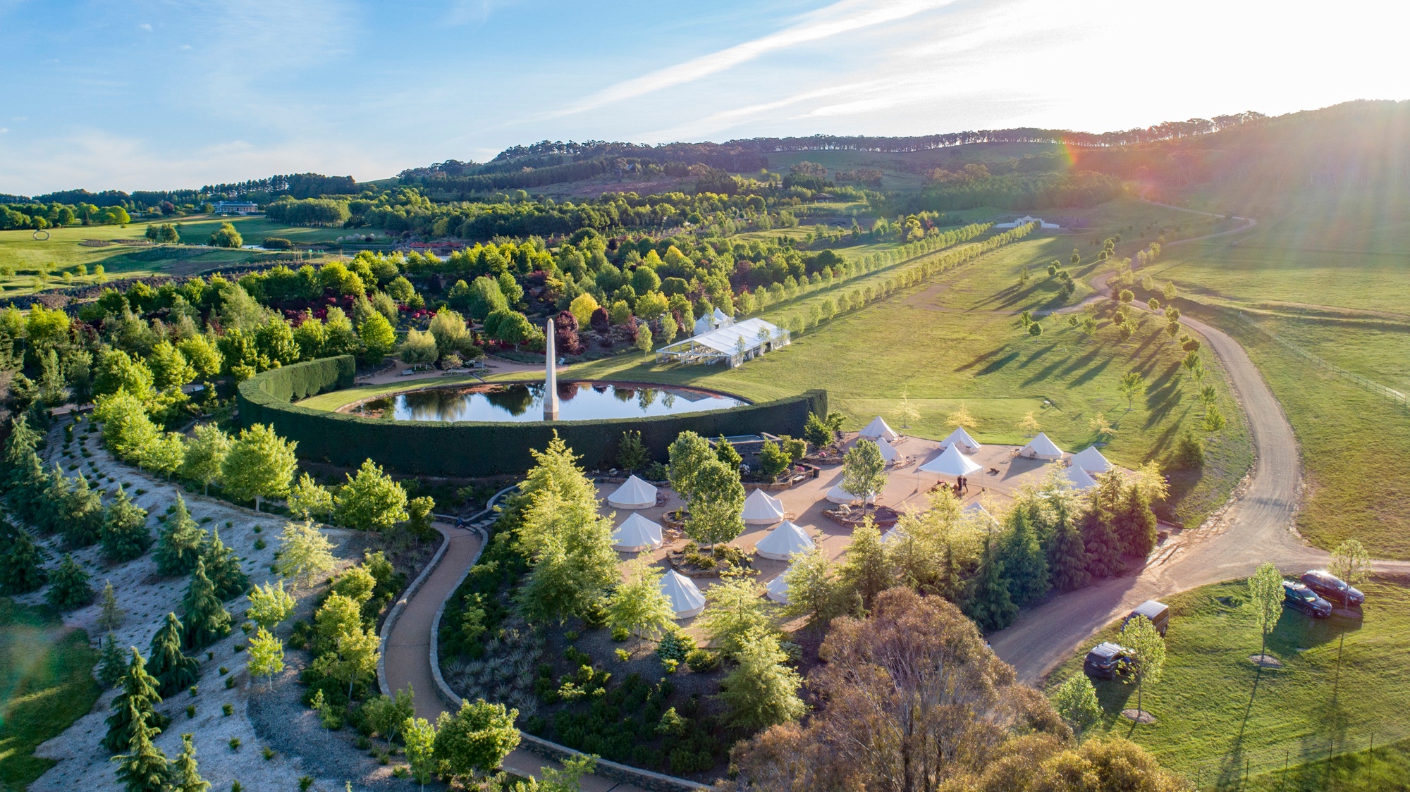 Aerial overlooking the scenic grounds of Mayfield Garden, Oberon.