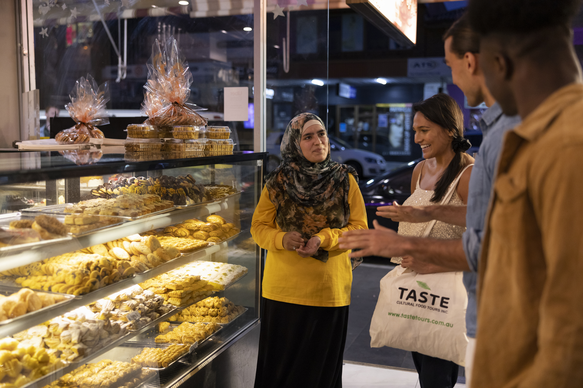 Friends browsing the sweets on display at Asal Sweet, Merrylands. Asal Sweet is an included location for visitors booked on a Taste of Persia Food Tour. For more details, visit: https://www.tastetours.com.au/